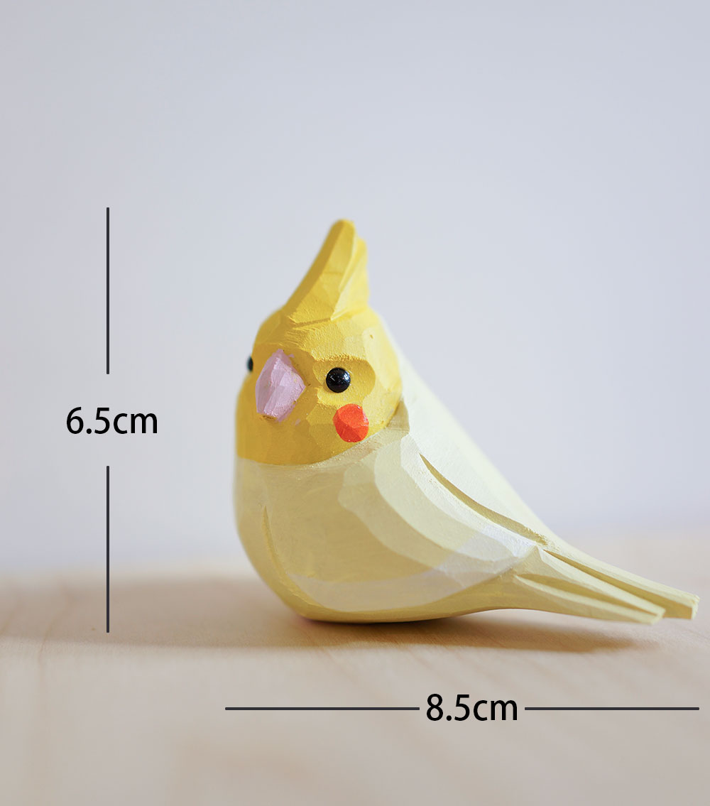 Available in two variations—classic yellow cockatiel and elegant grey cockatiel—these little parrots measure approximately 6.5 cm tall, 8.5 cm long, and 4 cm wide, making them the perfect size for desks, shelves, or any cozy corner.
