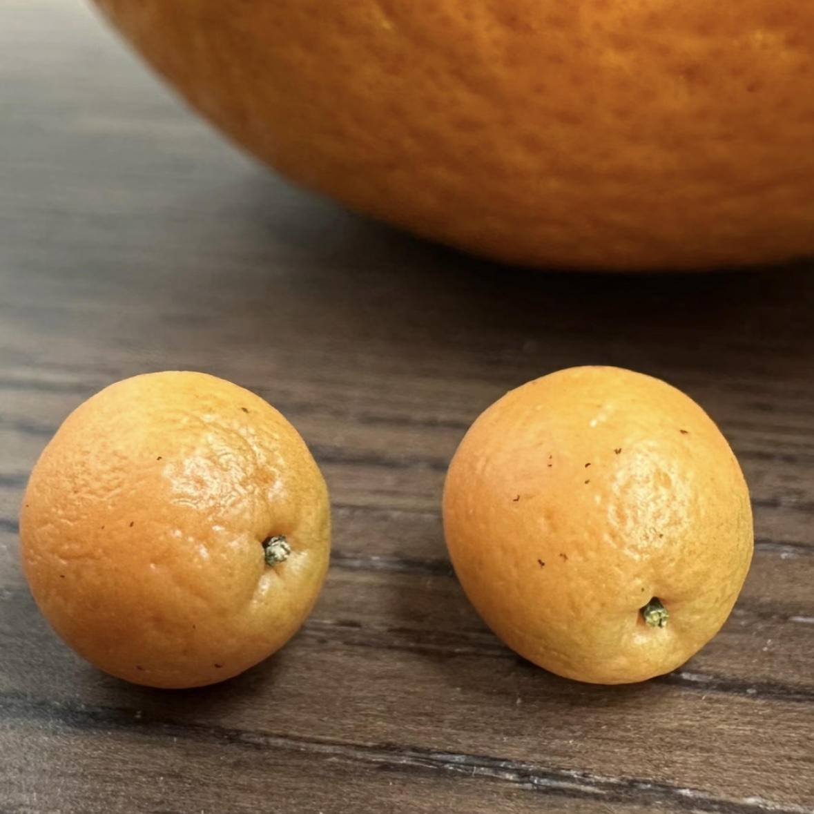 Discover a lifelike miniature orange handcrafted from polymer clay, measuring around 1cm. Each piece features tiny black specks on the peel and a realistic stem detail, making it perfect for dollhouse decoration, collectible displays, or tiny food props.